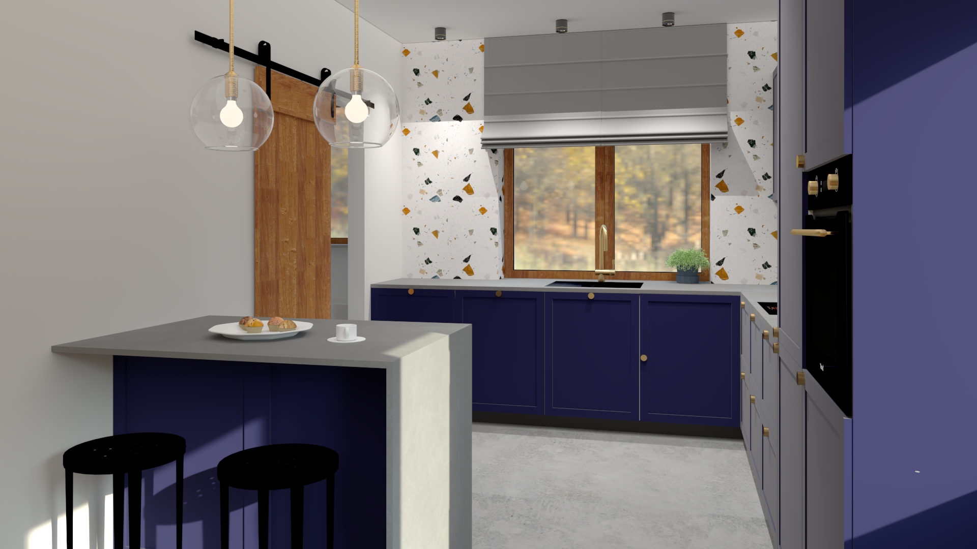 Projekt parteru wnętrza domu jednorodzinnego dla młodego małżeństwa, którego marzeniem stała się kuchnia w odcieniach granatu.