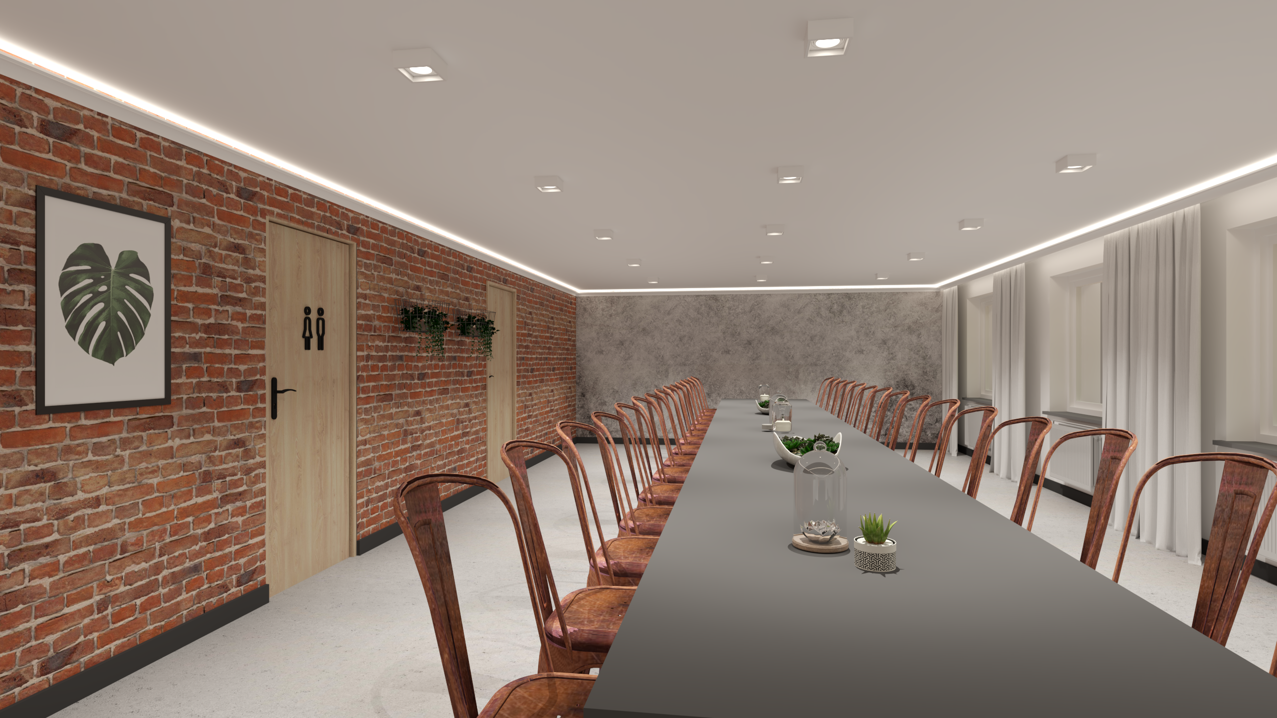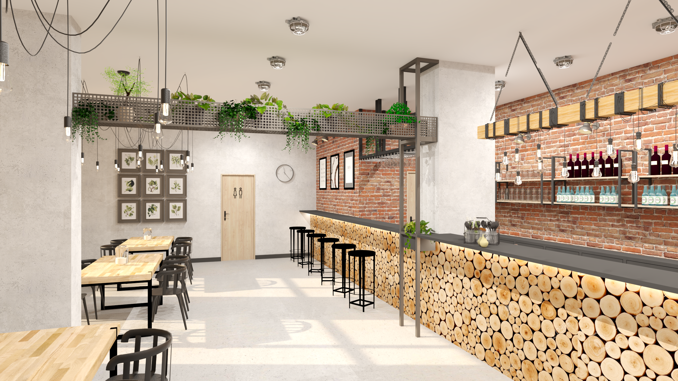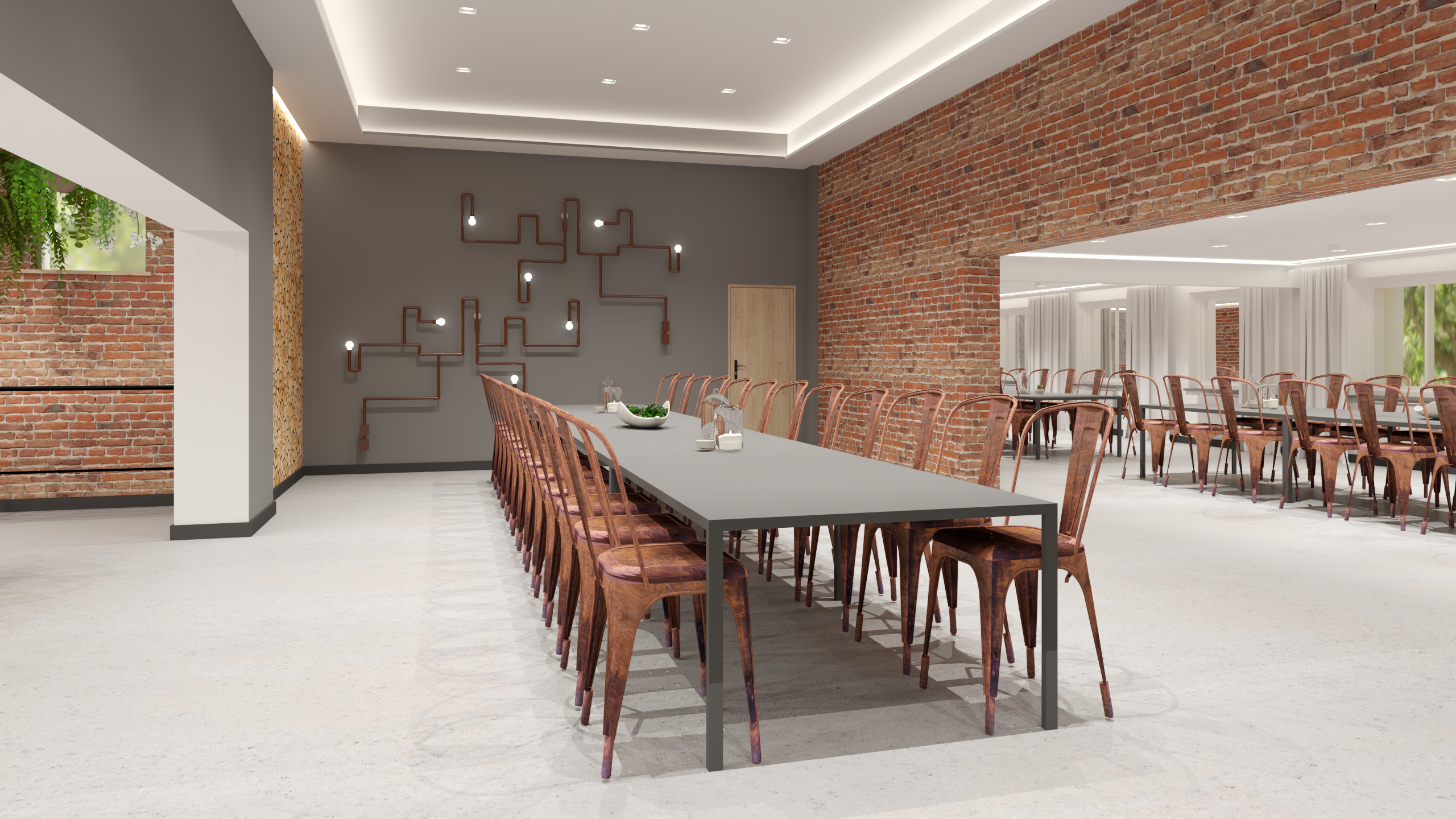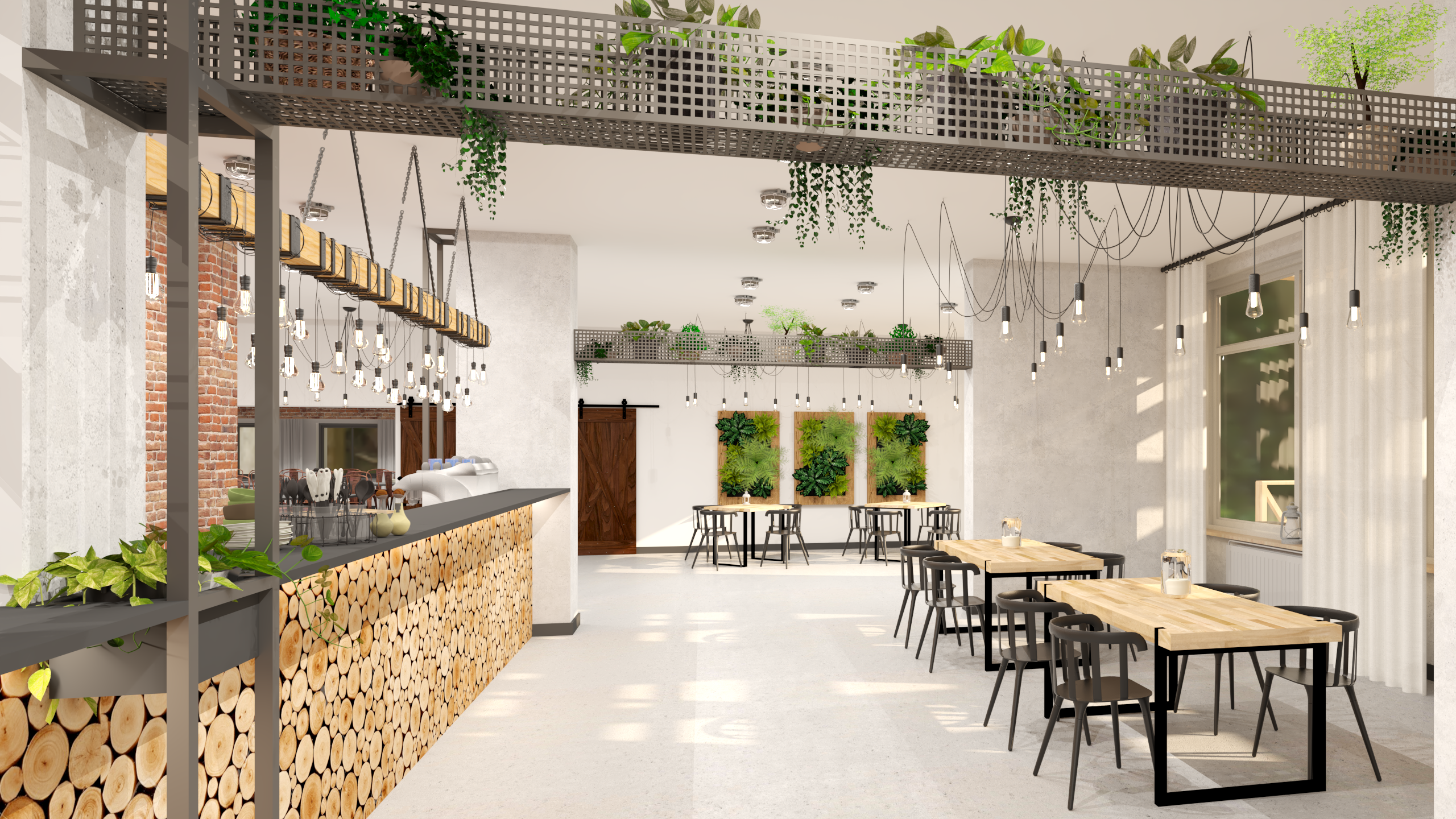 Uzyskany klimat nawiązuje do stylu industrialnego, którego surowość przełamuje duża ilość roślin oraz drewno.